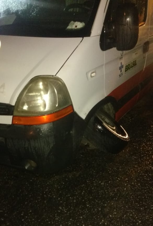 O motorista ao fazer a conversão na Rua do Prado para seguir pela Rua São José, no bairro Santo Antônio, viu a roda cair. Felizmente não havia paciente na viatura de placas QOF – 7990 – Patos.