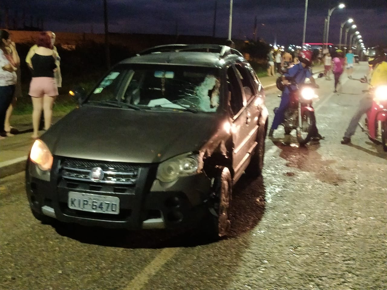Ela guiava uma motocicleta que bateu em um veículo Fiat Palio Weekend, cor cinza.