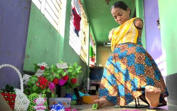 Ela nasceu sem os braços e superou grandes obstáculos para se tornar uma hábil artesã.