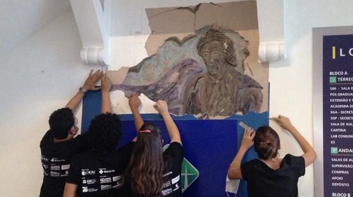 Alunos acham imagem sacra escondida sob reboco em patrimônio histórico