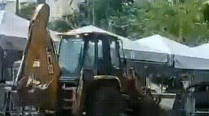 Homem chega de retroescavadeira para se vacinar contra Covid-19, em drive-thru