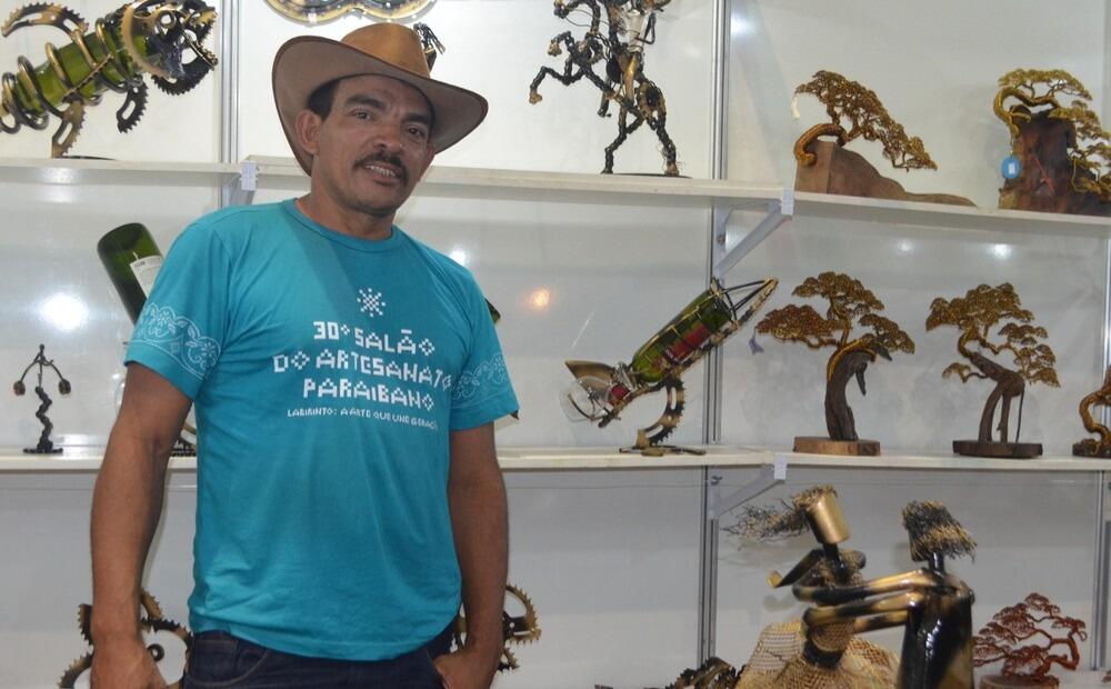 Economia criativa e cuidado com o meio ambiente são os princípios que baseiam o trabalho de Amadeu Severiano da Silva. O artesão, de 46 anos, faz esculturas com metal reciclado. Nas mãos deles, o lixo se transforma em peças de luxo. Natural de João Pessoa, capital paraibana, ele é um dos expositores do 30º Salão do Artesanato da Paraíba, que acontece em Campina Grande até este domingo (30).