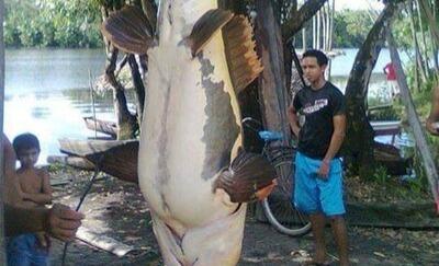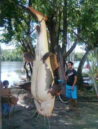 O peixe da foto foi pescado na semana passada no rio Madeira, afluente do rio Solimões ou Amazonas. A pesca, com linha e anzol, é um desafio para os pescadores. Quando fisgado, o peixe arrasta barcos e canoas para as margens.