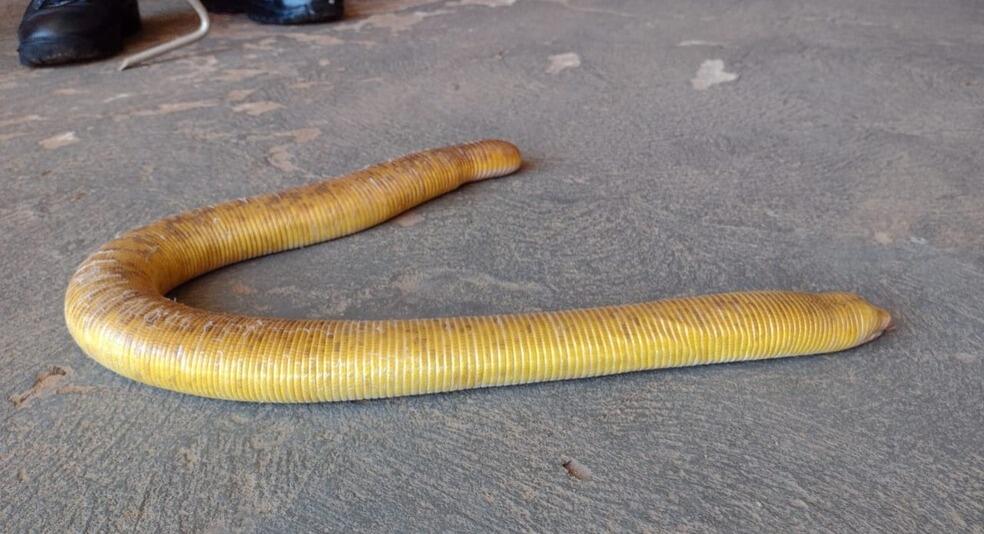 Uma dona de casa encontrou uma cobra-cega de quase 1 metro de comprimento dentro da residência dela, nesta quinta-feira (15), em Sorriso (MT). De acordo com o Corpo de Bombeiros de Mato Grosso, o tamanho da cobra-cega surpreendeu, pois, segundo a instituição, normalmente esse tipo de animal mede 30 centímetros.