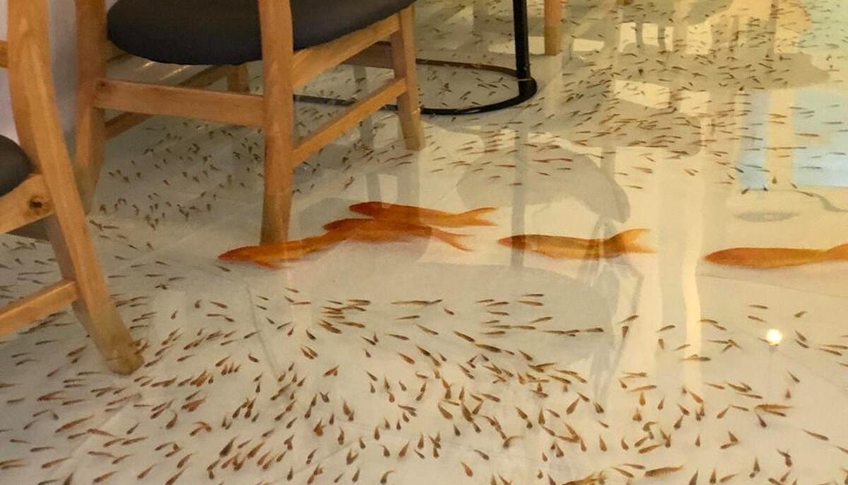 As inundações são um pesadelo para qualquer comerciante na cidade vietnamita de Ho Chi Minh (antiga Saigon), exceto para a cafeteria Amix, onde os clientes podem degustar a sua bebida com a água até a altura do tornozelo, enquanto os peixes passeiam ao redor.
