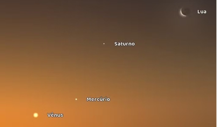 No caso de Vênus e Mercúrio, por estarem muito juntos do horizonte, será difícil notá-los. Já um pouco mais alto em relação ao horizonte, estará Saturno, visível até as 20h.