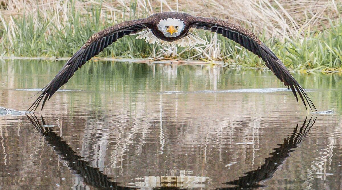 Na foto, a águia aparece em pleno voo sobre o rio e "olhando" para a câmera. Suas asas abertas tocam levemente a água, numa simetria perfeita.