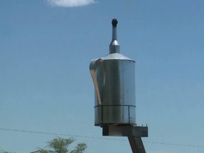 O primeiro objeto foi construído há 15 anos, e media 1 metro e 30 centímetros. Tinha capacidade para 105 litros do combustível e 12 quilos de corda.
