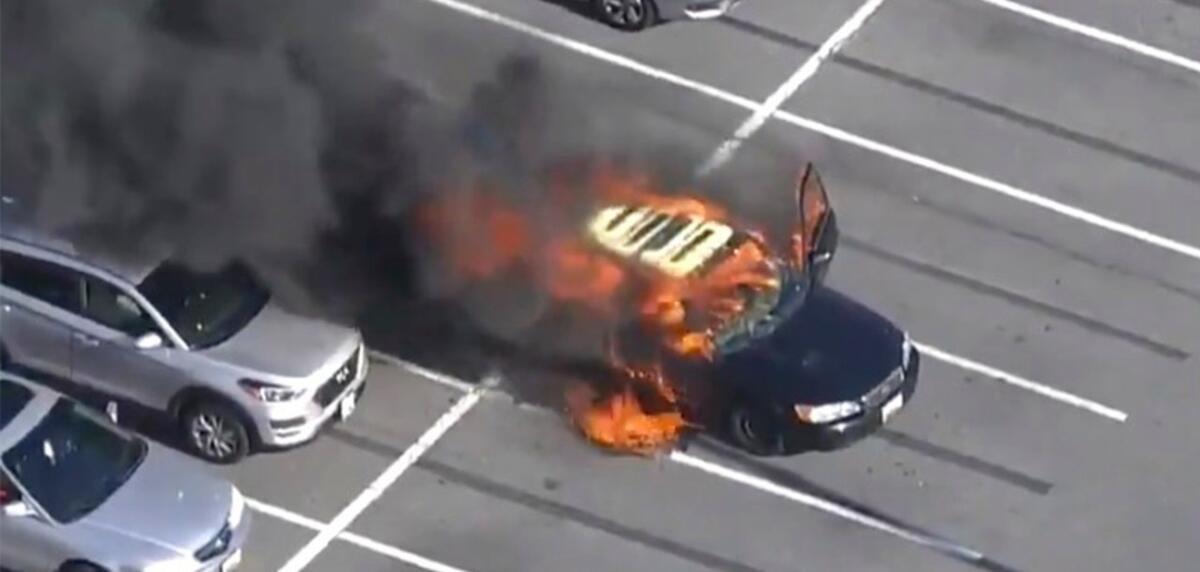 O momento foi registrado por um helicópitero de uma emissora de TV que passava pelo local no exato momento. As imagens compartilhadas pelo NYPost, mostram os bombeiros correndo para apagar o fogo que se alastrou por todo o carro.