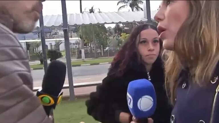 Lucas tentava falar com familiares das adolescentes quando Grace entrou na frente dele. “Dá licença, Grace, tá louca?”, disse ele ao empurrar a colega em uma cena que foi exibida ao vivo pelo Brasil Urgente.