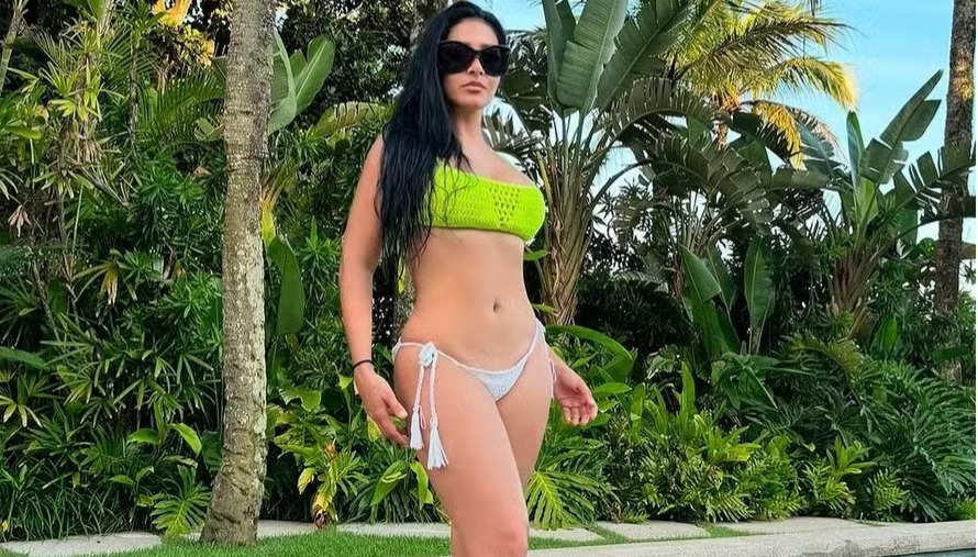 A cantora sertaneja publicou em seu perfil no Instagram algumas fotos com o conjunto formado por um top neon e calcinha branca. Ela complementou o visual com um par de óculos escuros. Na legenda, se limitou a publicar alguns corações verdes.