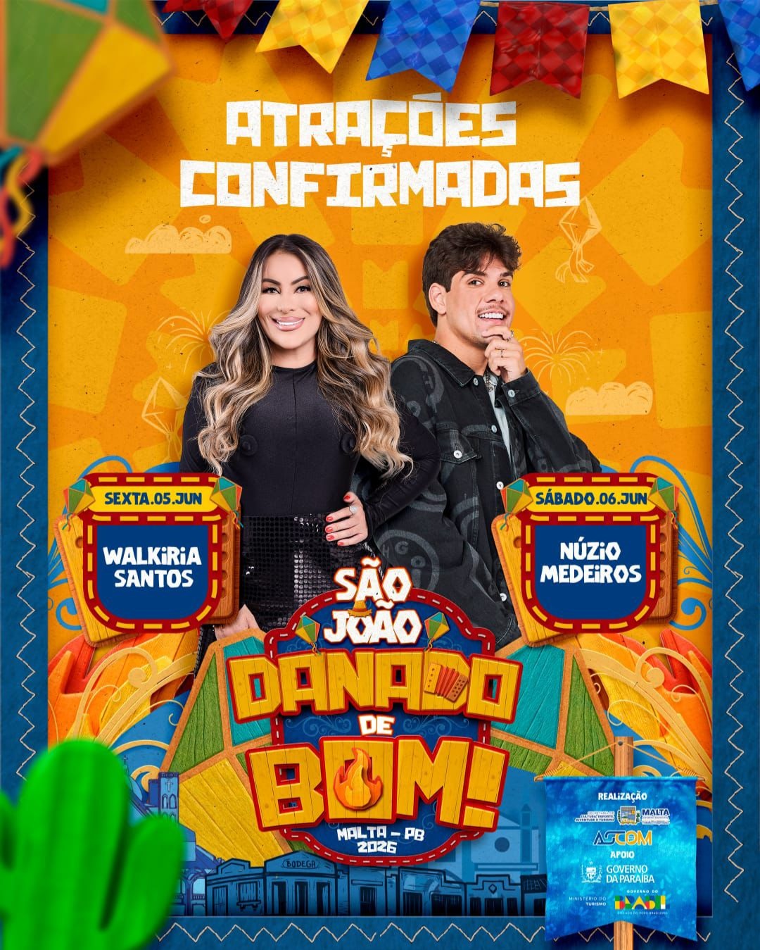 Malta reafirma sua força no calendário junino ao anunciar oficialmente as atrações surpresa do São João “Danado de Bom” 2026: Walkyria Santos e Nuzio Medeiros. A confirmação movimenta a cidade e eleva ainda mais a expectativa para o evento, que já desponta como um dos mais aguardados da região.