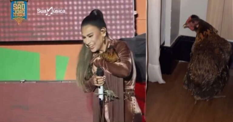 Ainda durante o show, Simone Mendes pediu para equipe desamarrar a galinha e colocar ela no camarim. “Dá milho, água e deixa ela solta”, pediu.