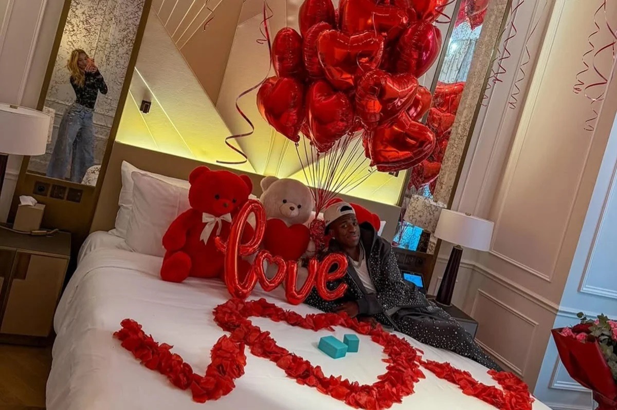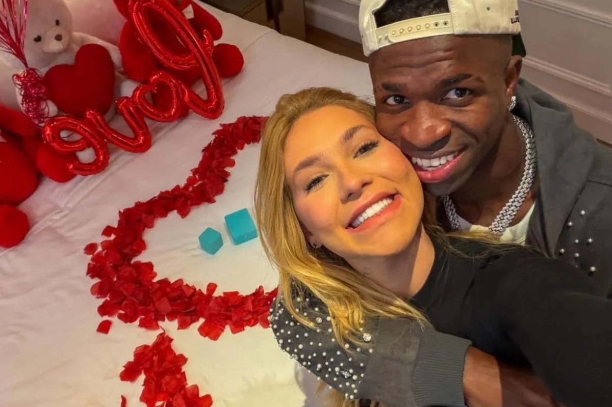 O namoro é real! Vini Jr., jogador do Real Madrid assumiu o namoro com a influenciadora Virginia Fonseca. O atleta publicou nesta terça-feira (28) fotos do pedido de namoro, que contou com ursinhos, rosas e um anel da Tiffany no quarto onde ela está hospedada.