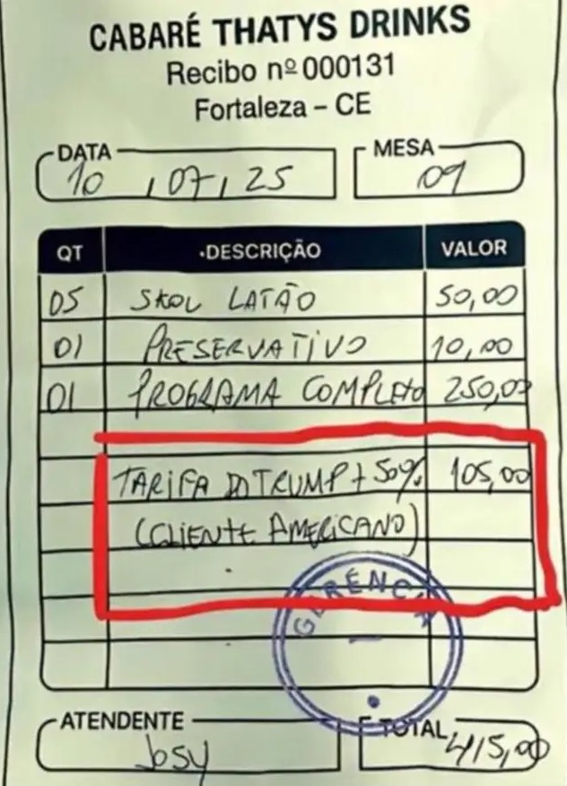 Uma foto que viralizou nas redes sociais nessa quinta-feira (10) mostra uma suposta comanda de um estabelecimento em Fortaleza (CE), chamado de Cabaré Thatys Drinks, com a descrição de consumação de um cliente no local. Ao final, existe uma observação que acrescenta a tarifa do Trump de 50%, pelo fato de o suposto cliente ser americano.