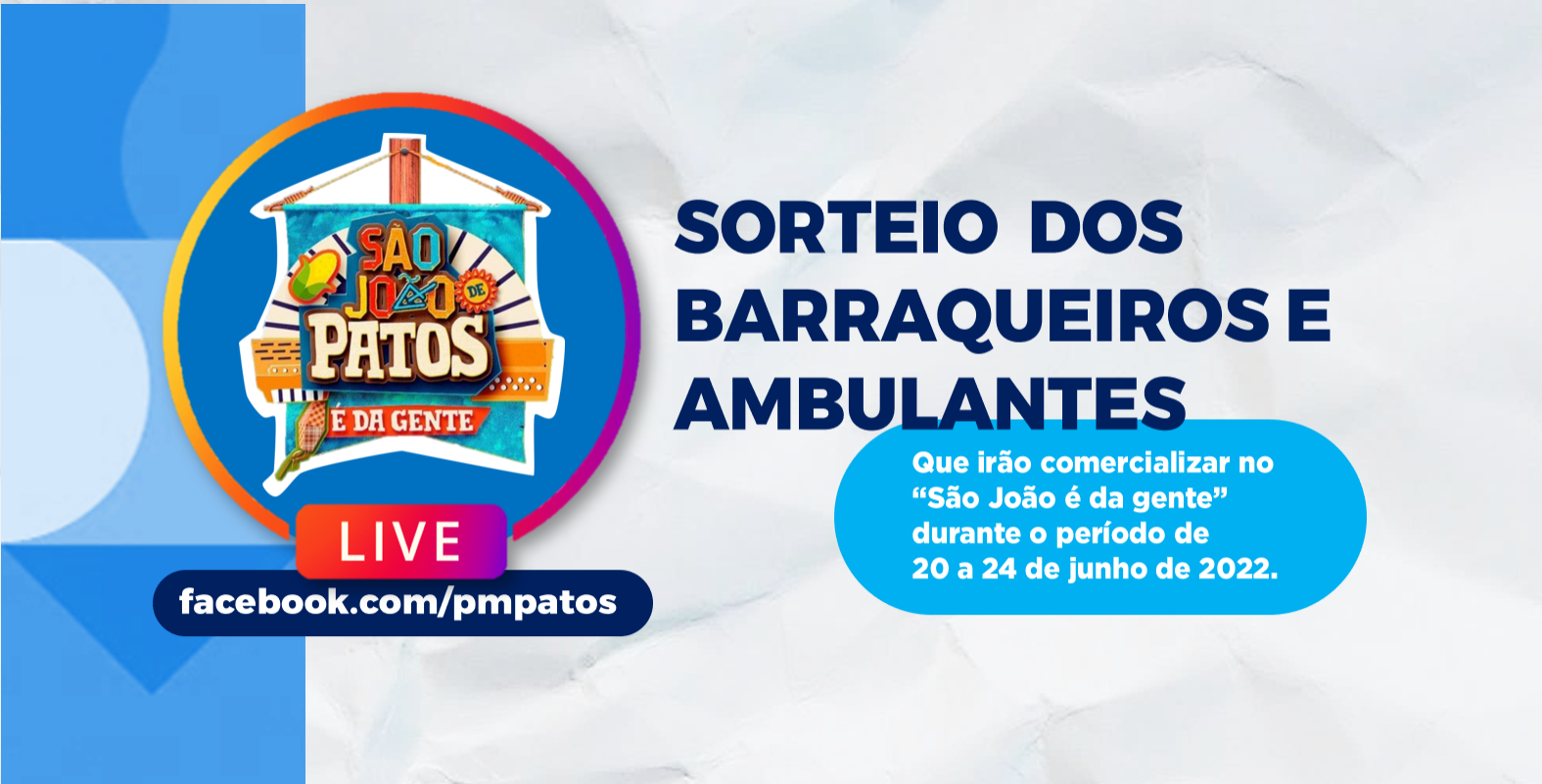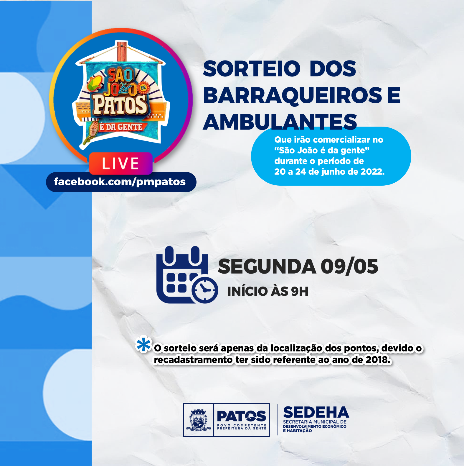 A Prefeitura de Patos, por meio da Secretaria de Desenvolvimento Econômico e Habitação, COMUNICA que na próxima segunda-feira, dia 09 de maio, irá realizar uma live de sorteio do local dos barraqueiros e ambulantes que irão trabalhar no “São João é da Gente” durante o período de 20 a 24 de junho de 2022.
