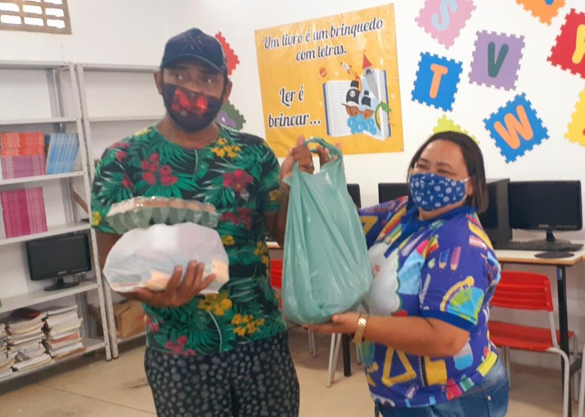 Outra escola que também distribuiu os kits de alimentação com incremento do PAA foi a EMEF Antônio Guedes, localizada no bairro do Mutirão. A gestora escolar, Eliete Nóbrega, destacou o emprenho e a disposição da equipe na montagem e distribuição dos kits para as famílias.