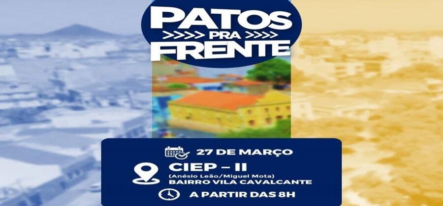 A Prefeitura de Patos realizará, no próximo domingo, 27 de março, mais uma edição do programa Patos pra frente, que leva todas as ações das secretarias aos bairros da cidade.