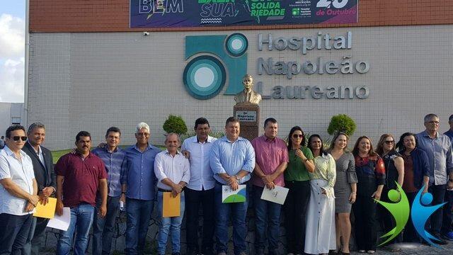 Em um evento organizado pela Federação das Associações de Municípios da Paraíba – FAMUP, no auditório da unidade de saúde, cerca de 50 prefeitos paraibanos estiveram participando da assinatura simbólica dos convênios que foram aprovados com base em leis municipais para repasse de verbas para o Hospital Napoleão Laureano.