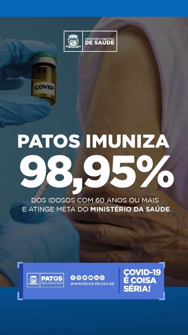 A Prefeitura de Patos e a Secretaria Municipal de Saúde confirmaram nesta segunda-feira (19) que atingiram a meta de vacinação dos idosos com 60 anos ou mais, contra a Covid-19.