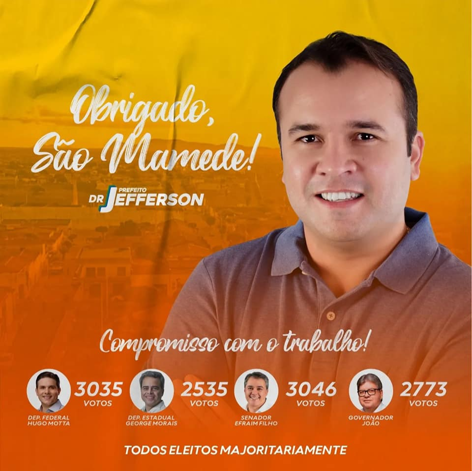 Com uma votação estrondosa, Dr. Jefferson deu importante colaboração para a eleição do deputado federal e agora senador eleito Efraim Filho, para a reeleição para deputado federal de Hugo Motta, eleição do estreante na política George Morais eleito deputado estadual e eleição para governo estado onde apoiou João Azevedo.