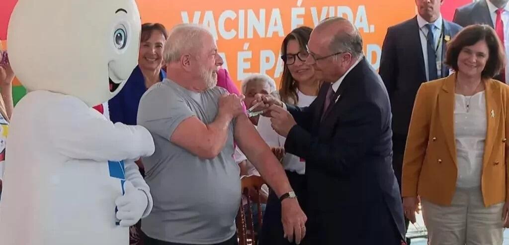 O presidente Luiz Inácio Lula da Silva recebeu nesta segunda-feira (27) a dose da vacina contra Covid-19 bivalente das mãos do vice-presidente Geraldo Alckmin, em uma cerimônia que contou com a presença da ministra Nísia Trindade (Saúde) e de Zé Gotinha, além da primeira-dama Janja Lula da Silva, no Centro de Saúde nº 1 no Guará, região administrativa do Distrito Federal.