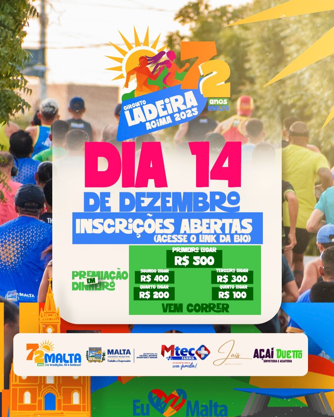 Já estão abertas as inscrições para a 3ª edição da Corrida de Emancipação de Malta, a tradicional Ladeira Acima. O evento será realizado no dia 14 de dezembro, com largada às 06h da manhã, e promete reunir atletas de toda a região.