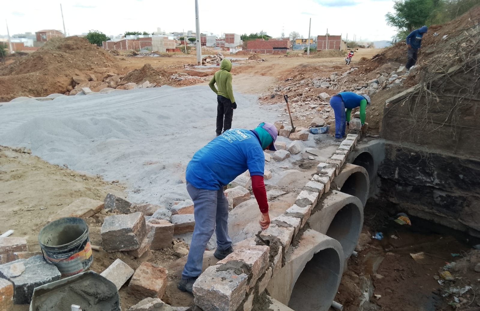 Para viabilizar a ligação, está sendo construído um pontilhão em tubos de concreto armado no canal que cruza a avenida, garantindo segurança, escoamento adequado e resistência estrutural. Além disso, as equipes executaram melhorias nas galerias e realizaram serviços de terraplanagem em ruas adjacentes, preparando o solo para as próximas etapas.