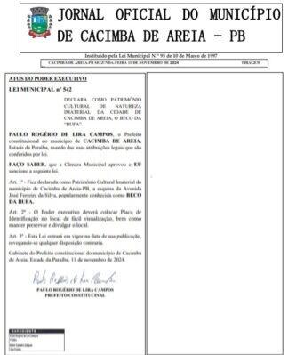 Em publicação no Jornal Oficial do Município de Cacimba de Areia, a partir de agora, a esquina da Avenida José Ferreira da Silva, popularmente conhecida como beco da bufa, é patrimônio cultural e imaterial.