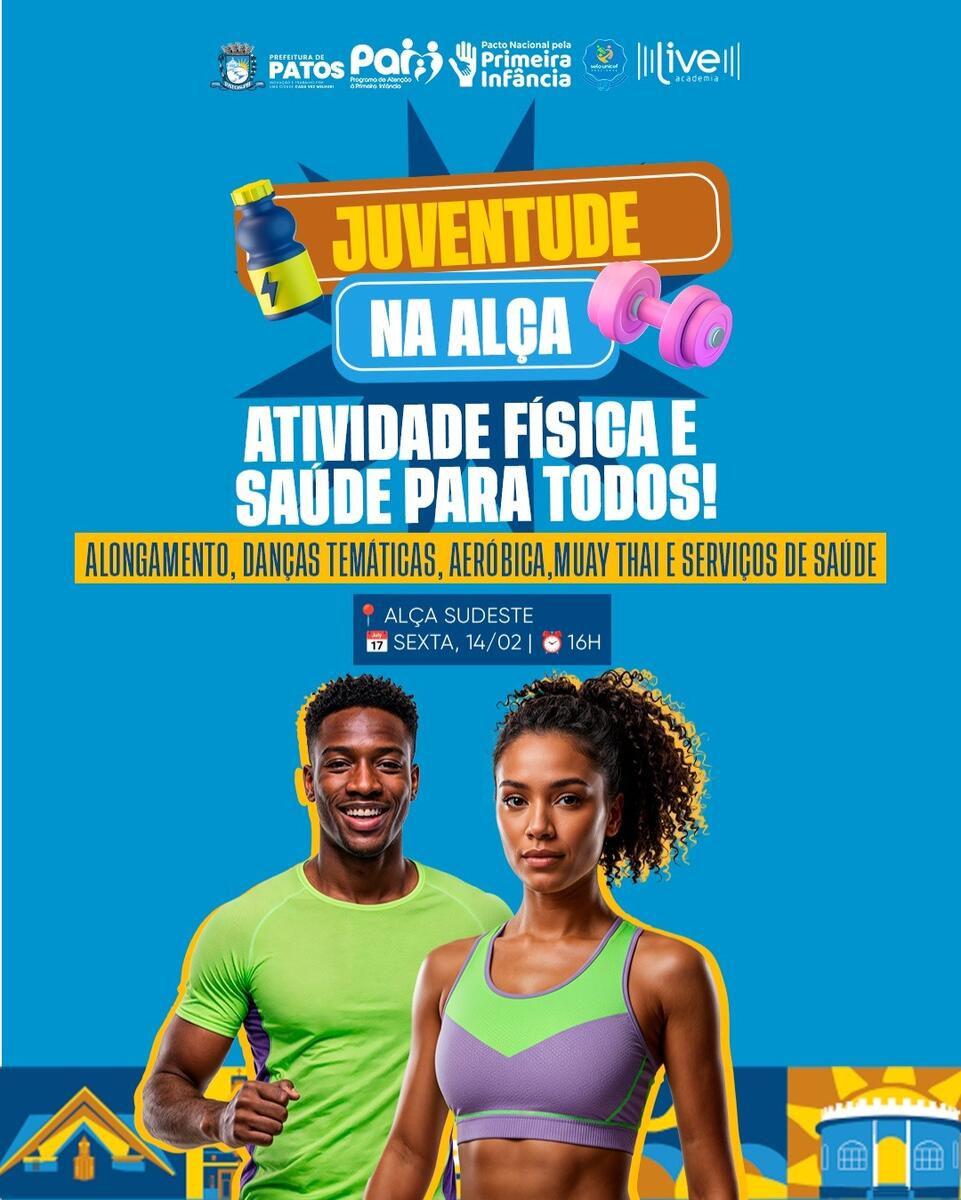 A Prefeitura de Patos, por meio da Secretaria Executiva de Esporte e Lazer e da Secretaria Executiva de Juventude, dará início hoje, 14 de fevereiro, à nova temporada do Juventude na Alça, a partir das 16h, na Alça Sudeste. O evento oferece atividades gratuitas para promover saúde e bem-estar, reunindo alongamento, danças temáticas, aeróbica e Muay Thai, além de serviços de saúde.