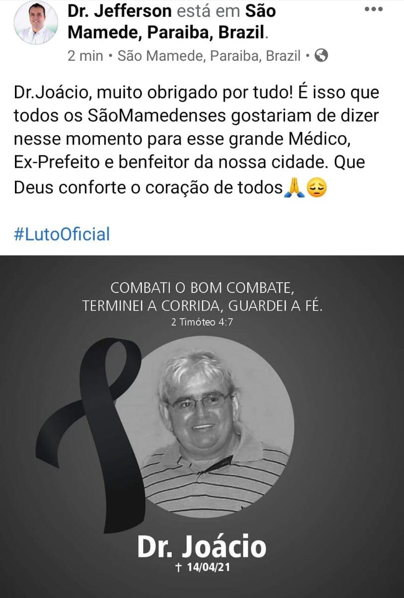 É com sentimento de pesar e de muito respeito que a Prefeitura de São Mamede-PB comunica o falecimento do Médico e Ex-prefeito da cidade Dr. Joácio Morais, ocorrido nesta manhã de quarta-feira (14/4), na cidade de João Pessoa, capital.