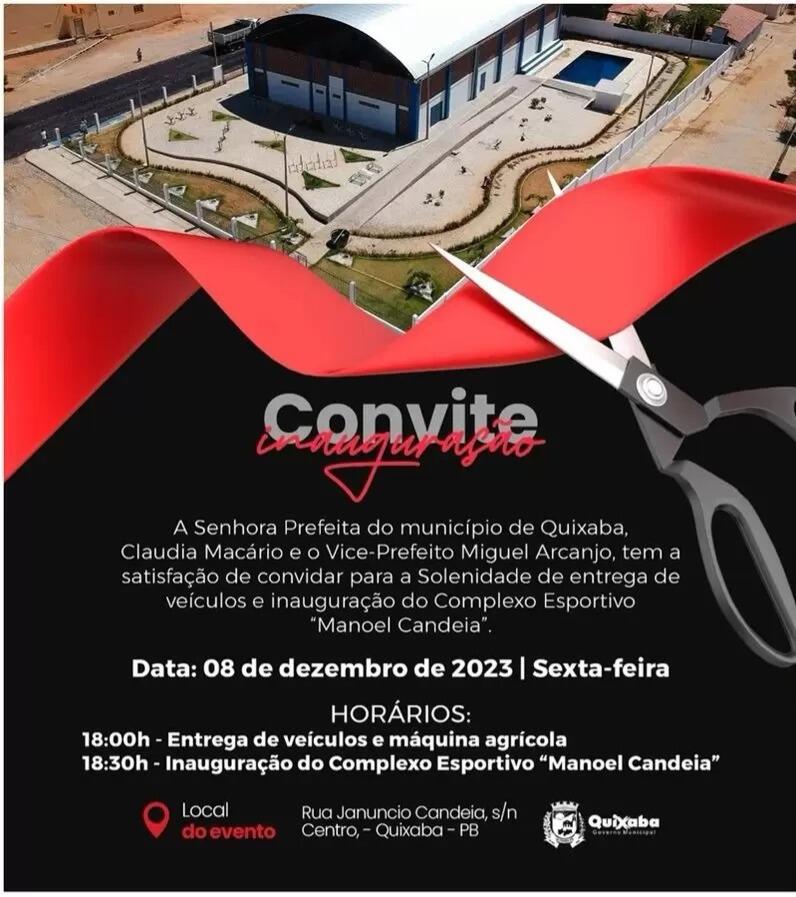 A prefeita Cláudia Macário, juntamente com o vice-prefeito Miguel Arcanjo, tem a satisfação de convidar toda a comunidade de Quixaba-PB para a solenidade especial que marcará a entrega de novos veículos para o município e a inauguração do aguardado Complexo Esportivo “Manoel Candeia”.