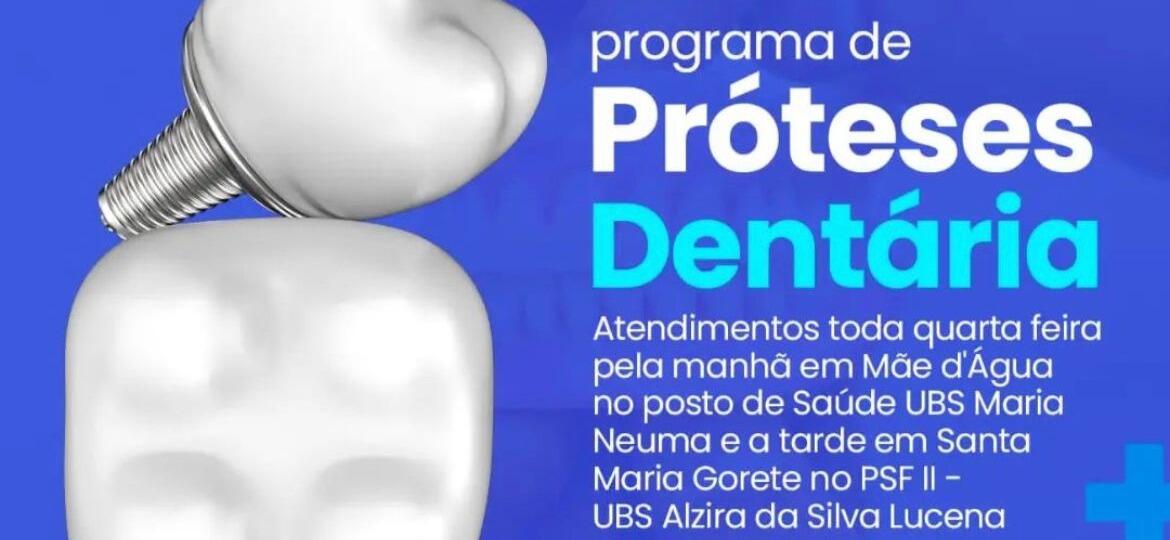 O município de Mãe d’Água reforça seu compromisso com a saúde bucal da população ao disponibilizar atendimento do Programa de Prótese Dentária todas as quartas-feiras.