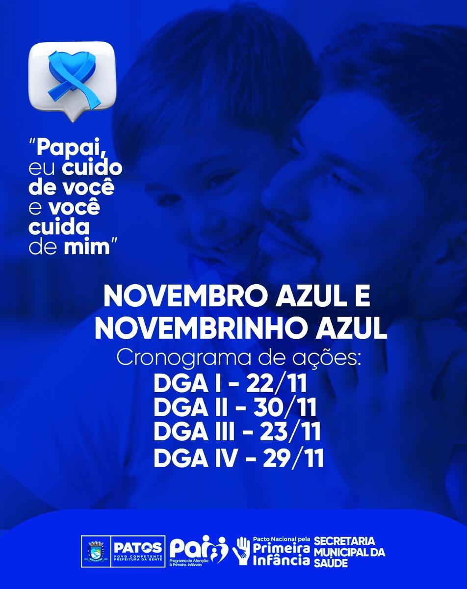 A Prefeitura de Patos, por meio da Secretaria Municipal de Saúde e Gerência de Atenção Básica, inaugura oficialmente a Campanha Novembro Azul no dia 22 de novembro, às 18h, na UBS Manoel Pereira, bairro Novo Horizonte, com o objetivo de conscientizar e prevenir as questões relacionadas à saúde masculina, sobretudo a importância do diagnóstico precoce e tratamento do câncer de próstata.