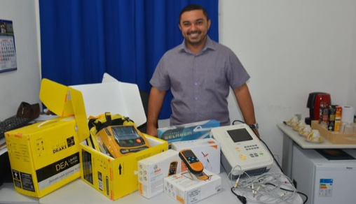 Os novos equipamentos consistem em, Eletrocardiograma digital (1), DEA - Desfibrilador externo automático (2), Oxímetro de pulso digital (3), Seladora de mesa (2), Balança infantil digital (3), Maca hospitalar (2), ar condicionado (5) e cadeiras odontológicas (3).