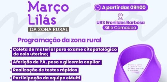 As atviddades inicaram pela sede do município e terão sequência na Zona Rural no dia 14 de março no Sítio Carnaúba na Unidade de Saúde Eronildes Barbosa a partir das 9h da manhã. As ações serão de coleta de material para exame citopatologico; realização de testes rápidos; aferição de PA, peso e glicemia capilar; avaliação nutricional dentre outras.