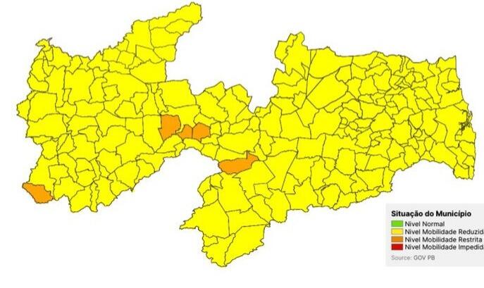 Estão classificadas em bandeira laranja, de acordo com a Secretaria de Estado da Saúde (SES), as cidades de Cacimba de Areia, Santa Inês, Santa Terezinha, São José do Bonfim e São José dos Cordeiros.
