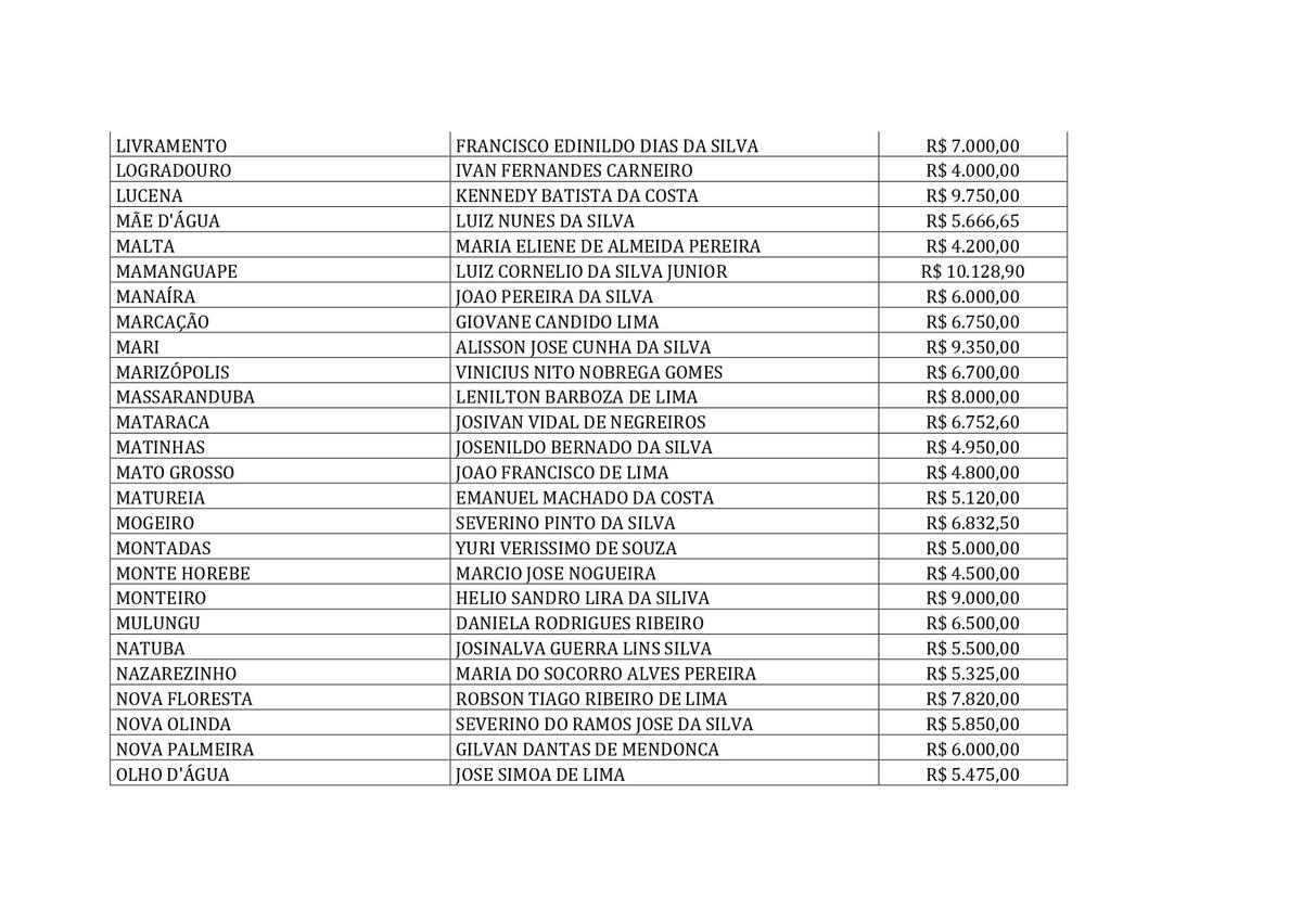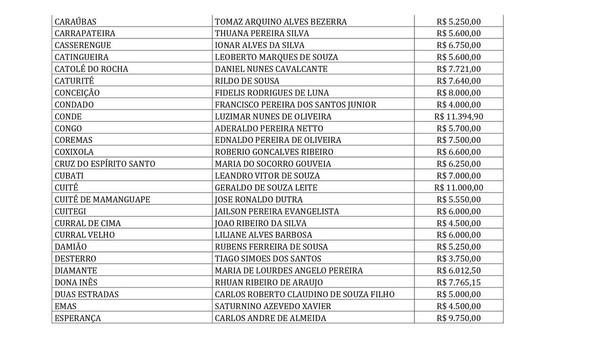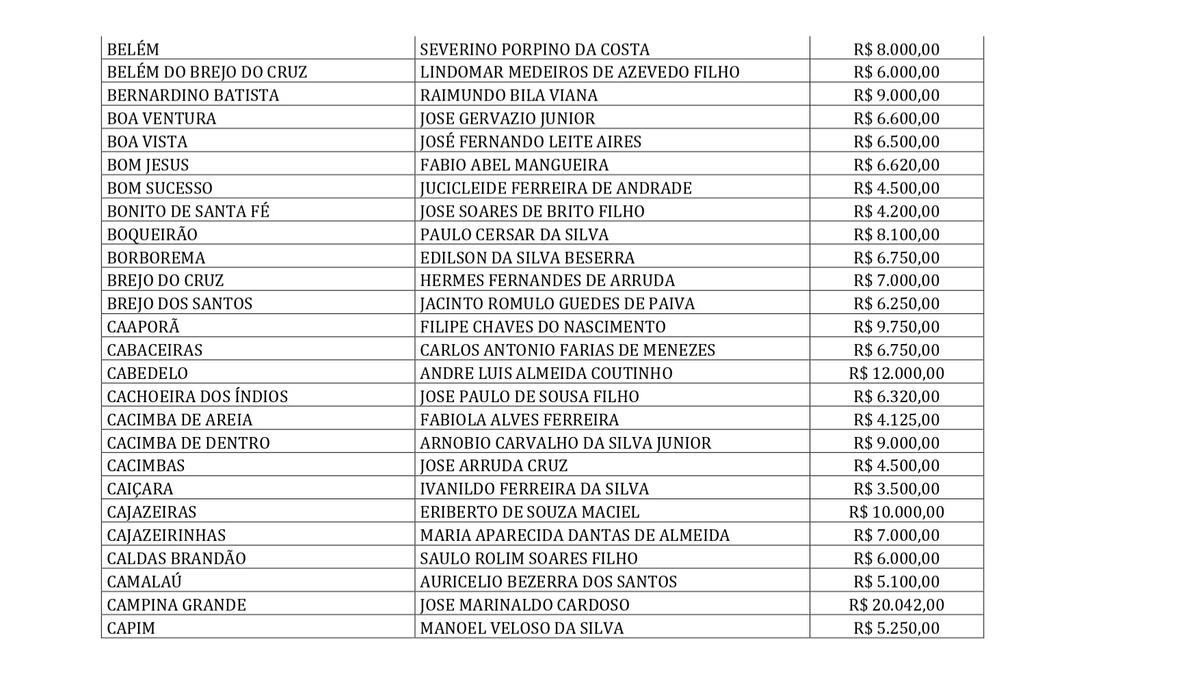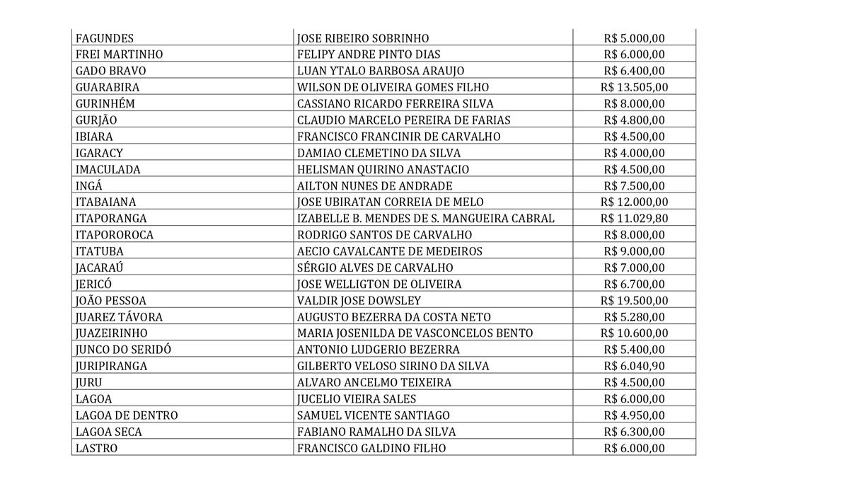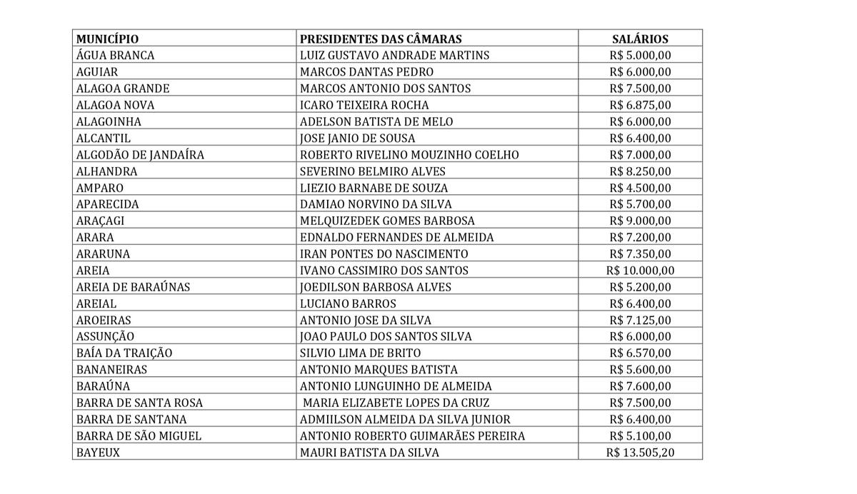Campina Grande lidera com a maior remuneração, enquanto o menor valor é pago ao presidente da Câmara Municipal de Santa Inês, Fagundes Ramalho, 3 mil. Nessa cidade, que fica no Sertão do Estado, tem 3.591 habitantes, distribuídos em uma área territorial de 327,635 km², de acordo com estimativa do Instituto Brasileiro de Geografia e Estatística (IBGE).