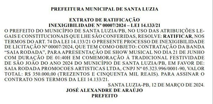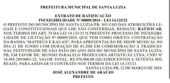 A Prefeitura de Santa Luzia começou a divulgar os valores dos contratos com os artistas que se apresentarão no São da Cidade. E os gastos iniciais já revelam que a festa custará caro aos cofres públicos. Conforme apurou o ClickPB, somente em três das principais atrações já se vão R$ 1,3 milhão de gastos, um valor que deve aumentar com a divulgação dos próximos contratos.