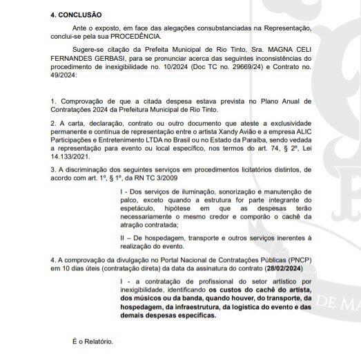 O Departamento de Auditoria do Tribunal de Contas do Estado da Paraíba (TCE-PB) emitiu um parecer para que a prefeita de Rio Tinto, Magna Celi, explique o gasto de R$ 400 mil com o show de Xand Avião. O cantor deve se apresentar na cidade no dia 21 de maio, na festa da padroeira.
