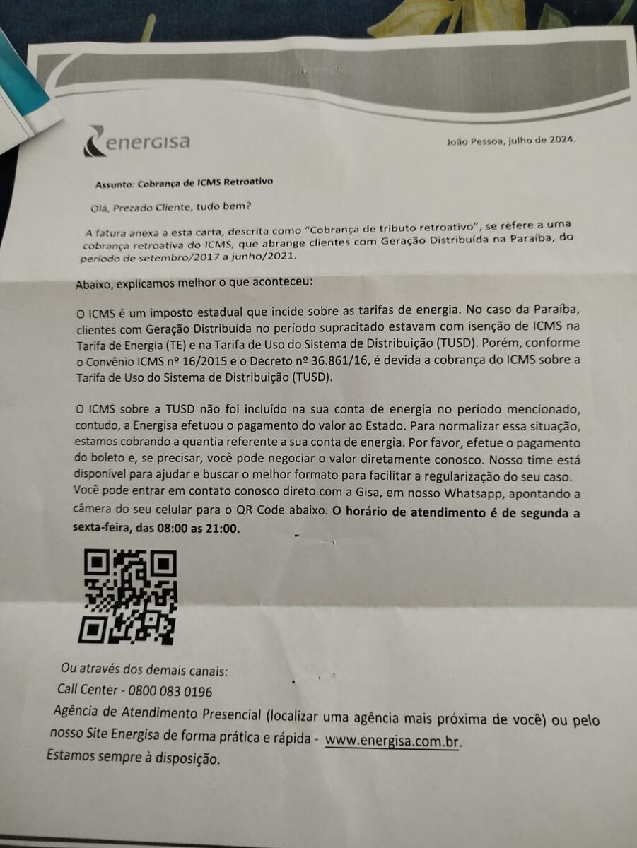 De acordo com a Energisa, a cobrança retroativa se deve ao reconhecimento de um erro junto à Fazenda Estadual, que resultou no pagamento do imposto atrasado e na subsequente repassagem desse valor aos consumidores. A empresa alega que os clientes foram devidamente informados sobre os valores tributados e o motivo da cobrança. Leia abaixo o aviso enviado aos consumidores.