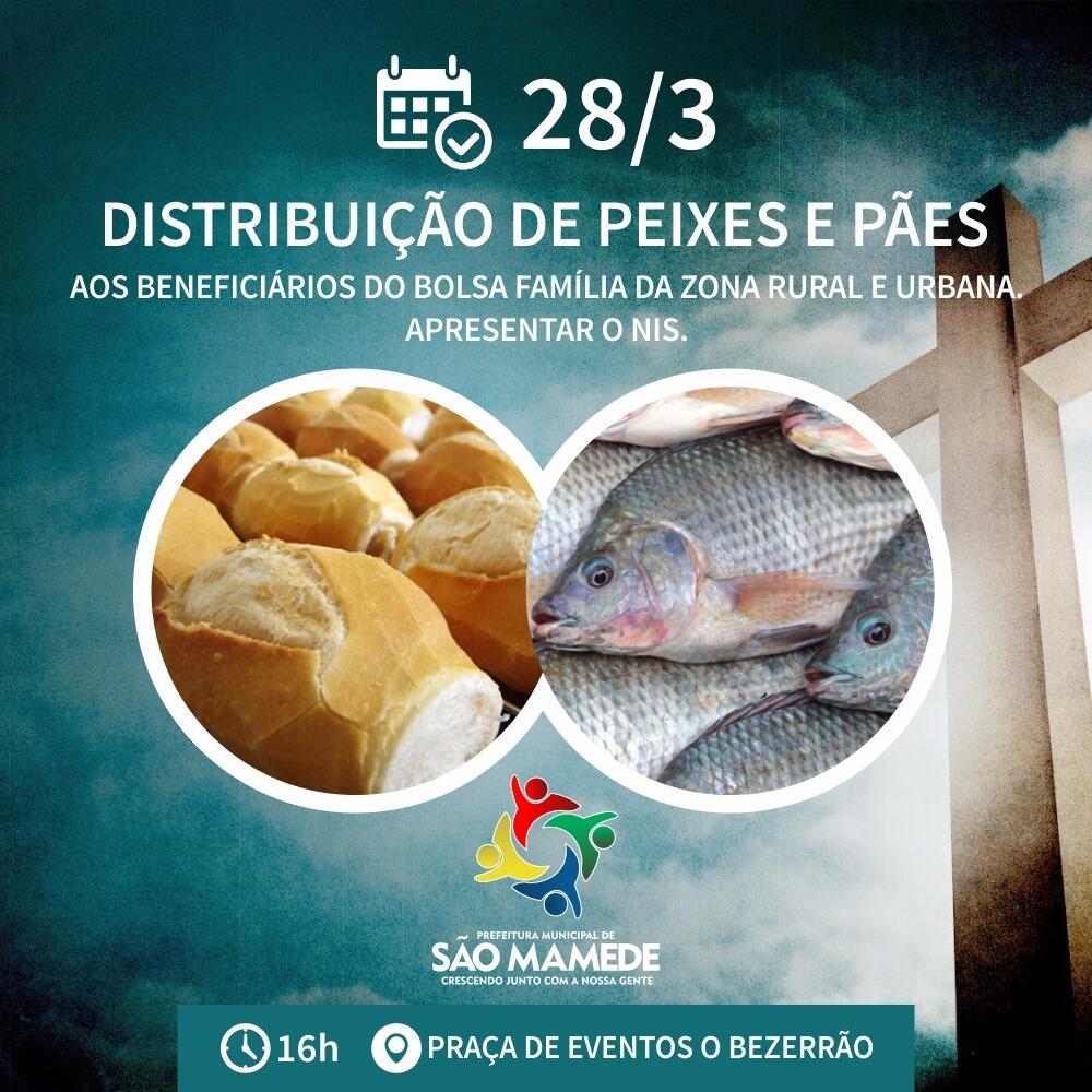 A Prefeitura Municipal de São Mamede, através da Secretaria de Assistência Social, vai distribuir, nesta quarta-feira(28), uma tonelada de peixes incluindo pães a todos os beneficiários do Bolsa Família, tanto os da zona rural quanto da urbana. A entrega será às 16h no Bezerrão.
