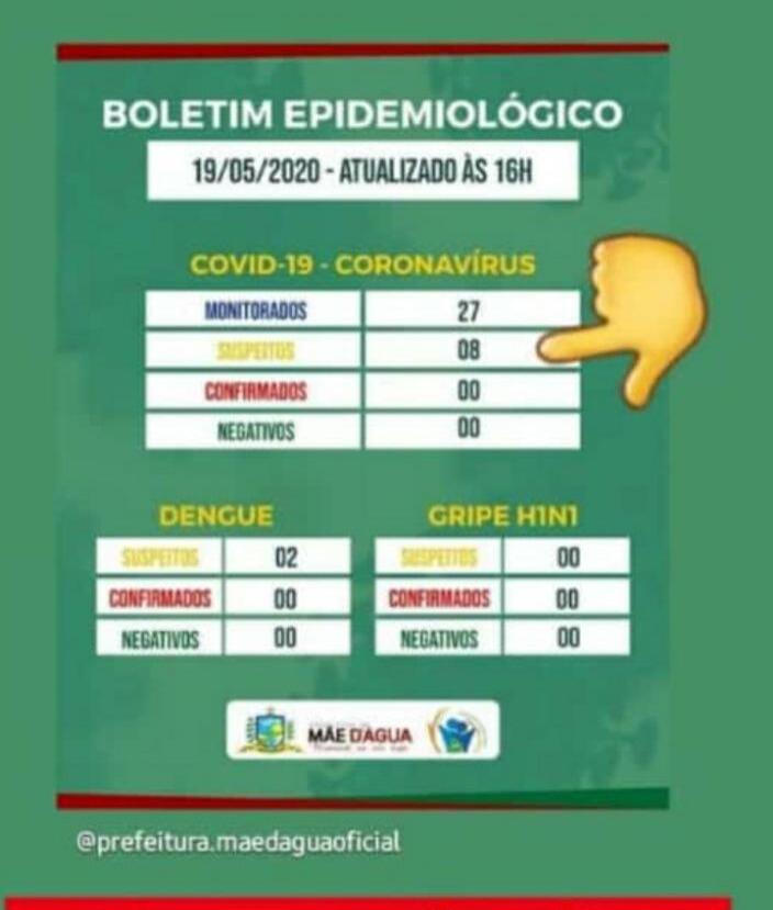 Em informações atualizadas na data de hoje, a Secretaria de Saúde de Mãe d’Água repassou que oito (08) pessoas foram atendidas com os sintomas da doença. Destas, quatro farão o teste rápido amanhã; e as demais, na próxima semana, seguindo as orientações do Ministério da Saúde que indica a realização do teste rápido somente a partir do 8º dia com sintomas.