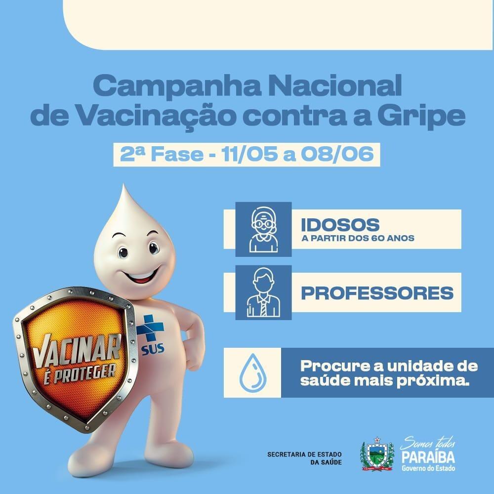 A campanha de vacinação contra a influenza na Paraíba começa a segunda etapa nesta terça-feira (11), conforme o cronograma da 23ª Campanha Nacional de Vacinação. Até o dia 8 de junho poderão se vacinar contra a gripe idosos com mais de 60 anos e professores. Na cidade de Patos, sertão do estado, procure a unidade de saúde mais próxima, das 07h às 11h, e das 13h às 17h.