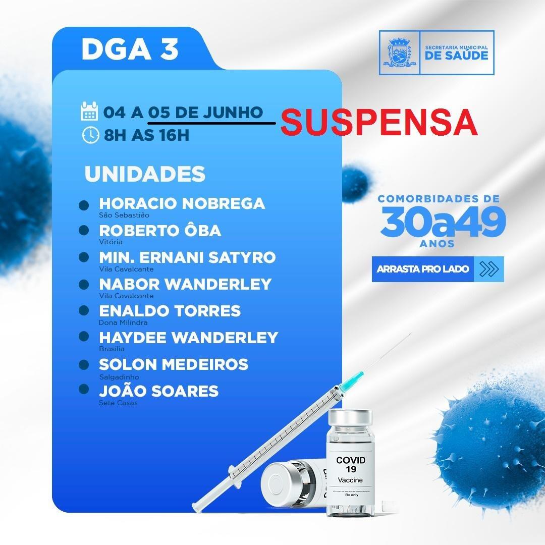 A Secretaria Municipal de Saúde de Patos comunica que a vacinação contra a Covid-19 nas pessoas com comorbidades a partir de 30 anos, que aconteceria neste sábado (05), está suspensa nas unidades de saúde do DGA 3, formado pelos bairros São Sebastião, Salgadinho e adjacentes.