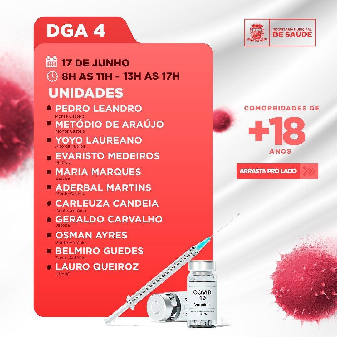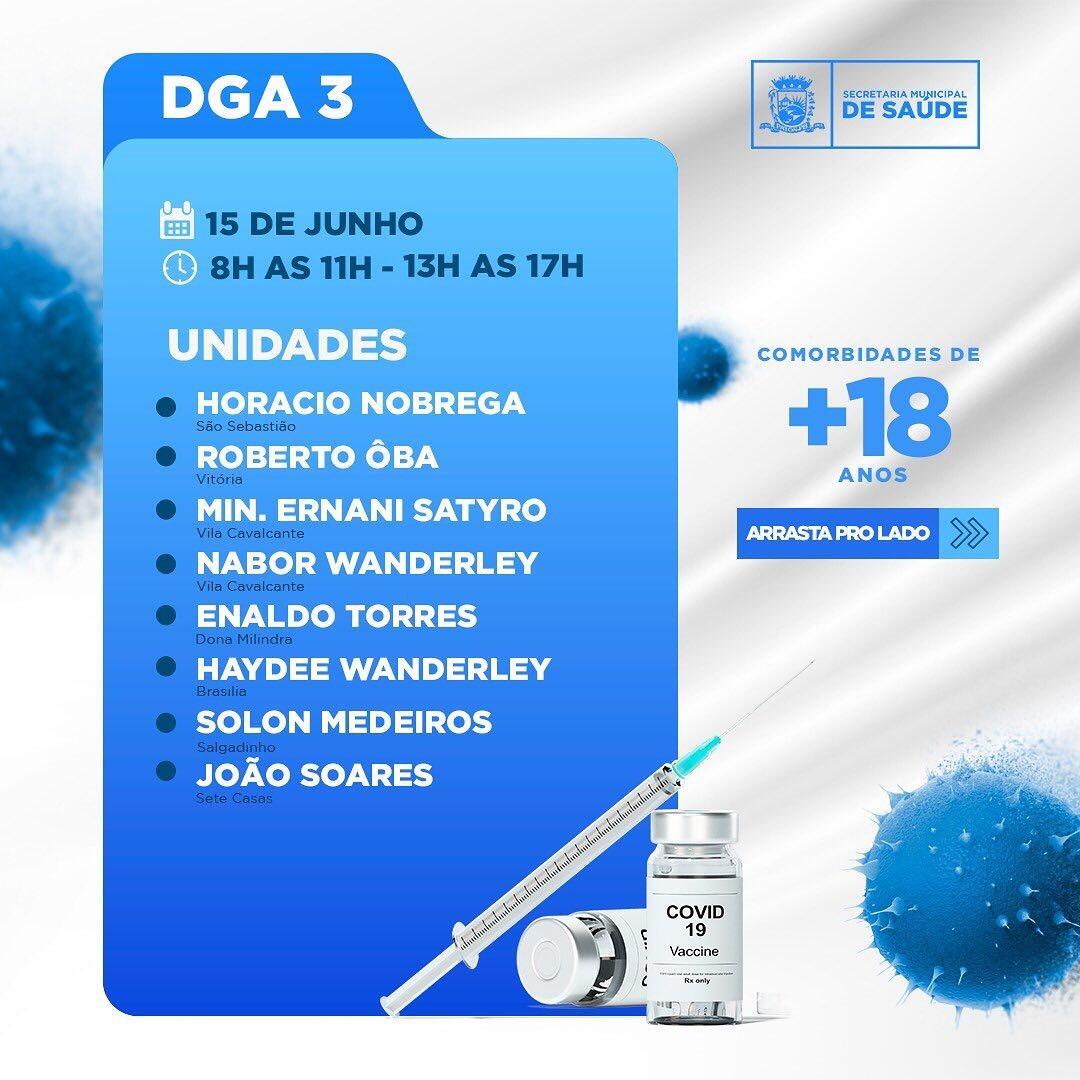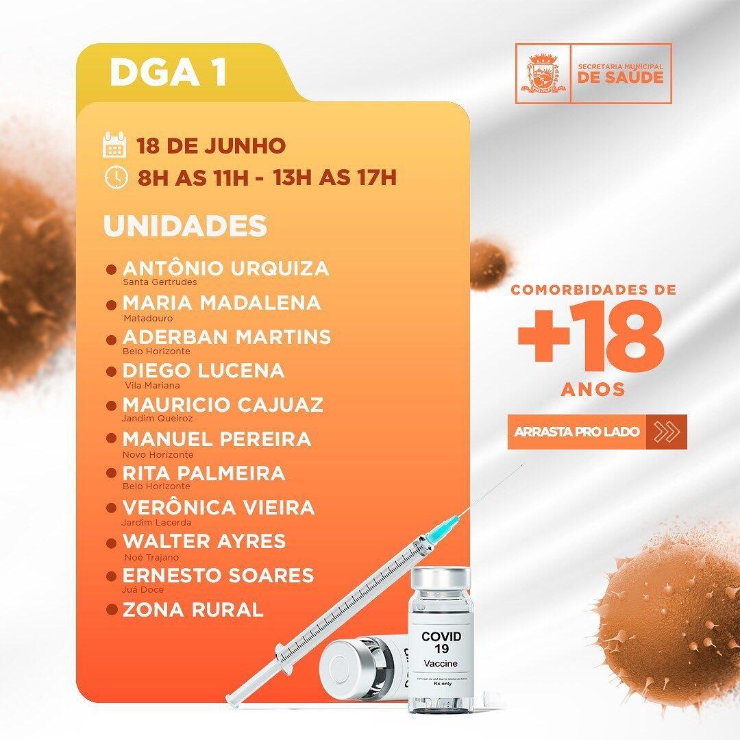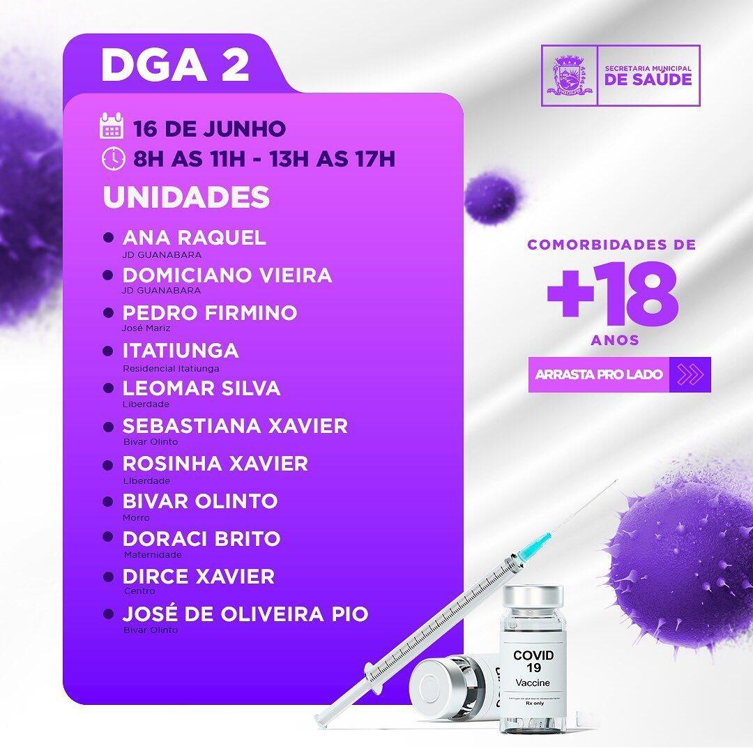 Portanto, as pessoas com comorbidades e com idades de 18 anos acima, começarão a ser imunizadas desta terça até a próxima sexta (15 a 18), sendo um dia para cada DGA ou área da cidade, conforme ilustração contida no calendário.