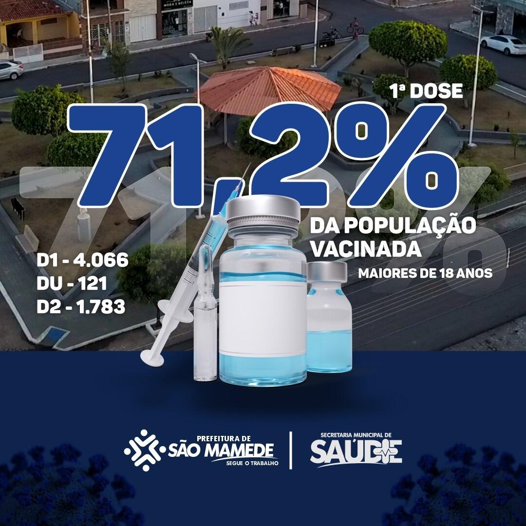 O muncípio de São Mamede, no Sertão paraibano, ultrapassou nesta quinta-feira a marca dos 70% da população vacinada com a primeira dose contra a Covid-19. Ao todo, segundo os dados de Secretaria de Saúde do município, São Mamede aplicou 5.970 doses, sendo 4.066 para primeira dose e 1.783 para segunda dose, além de 121 com dose única.
