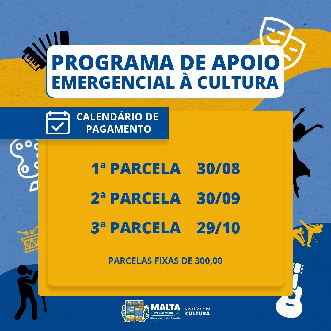 A Secretaria Municipal de Finanças e a Secretaria de Municipal de Esportes, Cultura e Turismo divulgaram as datas de pagamento das 03 (três) parcelas fixas de R$300 referentes ao Programa de Apoio Emergencial à Cultura de Malta, que já começou a ser feito na última segunda-feira (30) de agosto, o depósito foi referente a 1 parcela. As demais parcelas serão pagas de acordo com o edital do programa, ou seja, 30 dias úteis a partir do dia que foi paga a primeira. Sendo assim estão previstas da seguinte forma: 2° parcela será paga em 30 de setembro e a última parcela estará em conta no dia 29 de outubro.