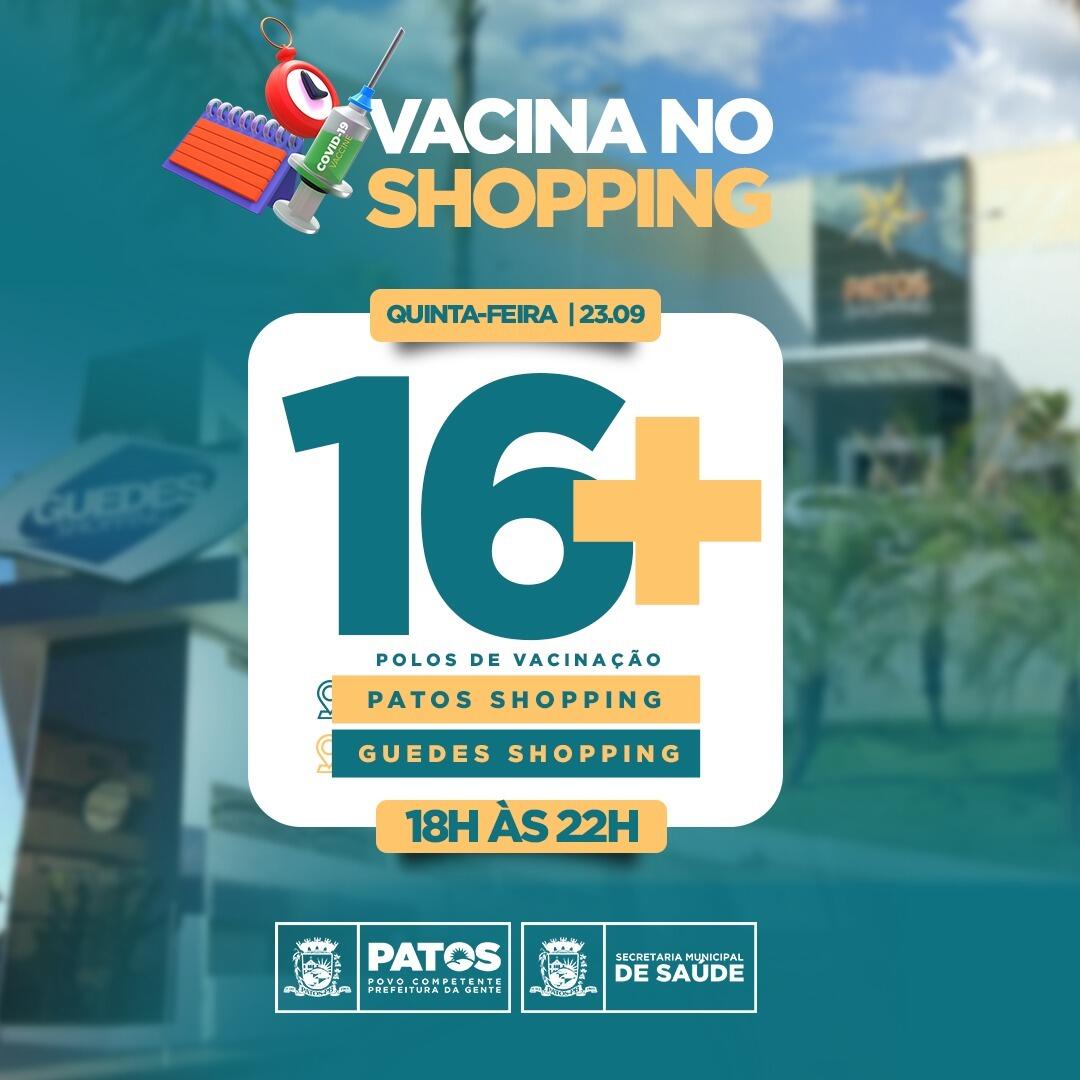 A campanha Vacina Patos segue cada vez mais perto de imunizar toda a população patoense. E nesta quinta-feira (23), a vacinação contra a Covid-19 será ampliada para atender o público geral dos adolescentes sem comorbidades, começando por quem possui 16 e 17 anos, no evento intitulado “Vacina no Shopping”.