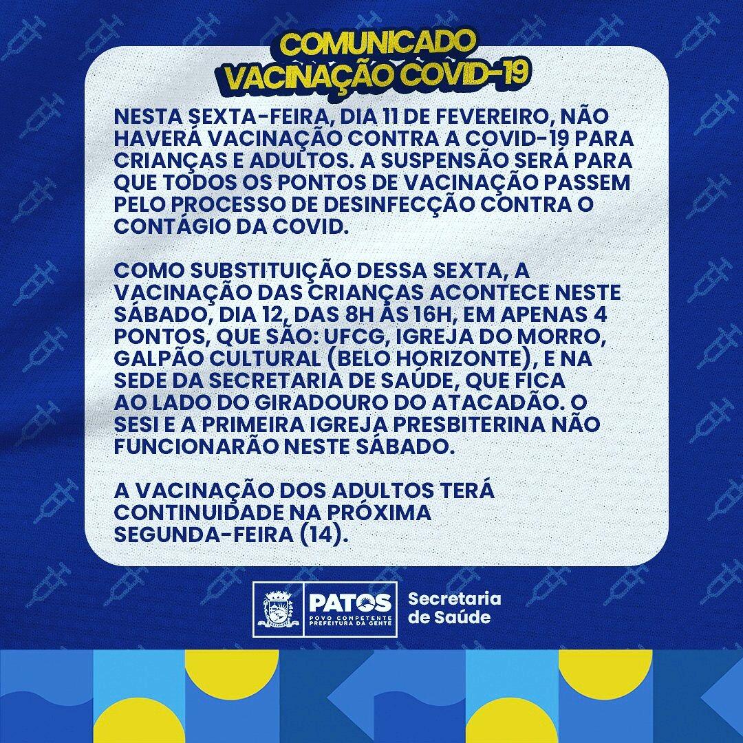 A Prefeitura de Patos, por meio da Secretaria Municipal de Saúde, comunica que nesta sexta-feira (11) não haverá vacinação contra a Covid-19, tendo em vista que os 4 pontos da vacinação de jovens e adultos, bem como a Primeira Igreja Presbiteriana de Patos, que está disponível para a vacinação das crianças, passarão pelo processo de desinfecção contra o contágio da covid.